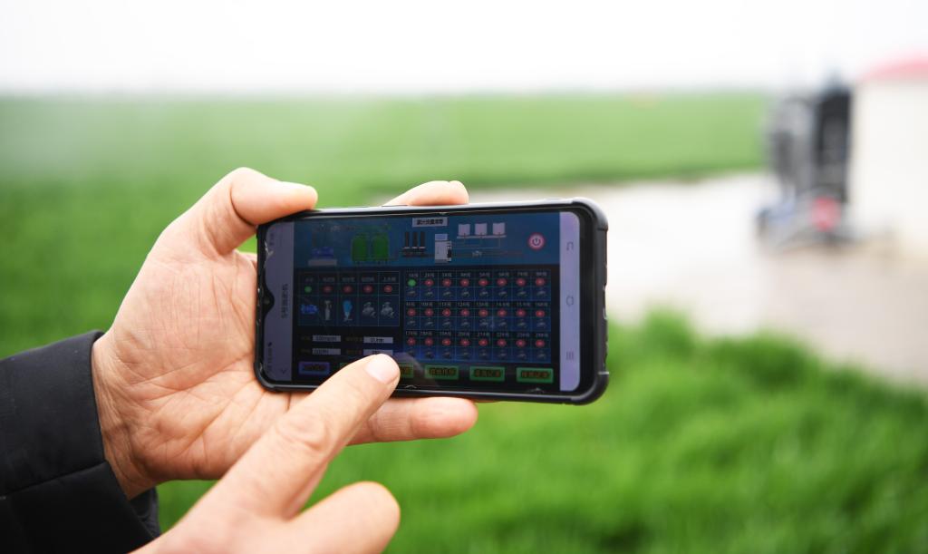 3月22日,邱守先在用手機(jī)操控水肥一體機(jī)對(duì)農(nóng)田進(jìn)行灌溉。新華社記者張浩然/攝
