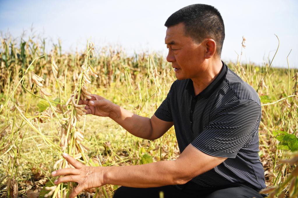 9月22日,邱守先在查看即將收獲的大豆。新華社記者張浩然/攝