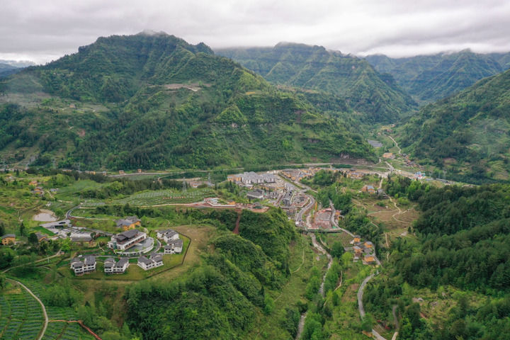 這是重慶石柱土家族自治縣中益鄉(xiāng)華溪村景觀(2022年4月14日攝,無人機照片)。新華社記者 唐奕 攝