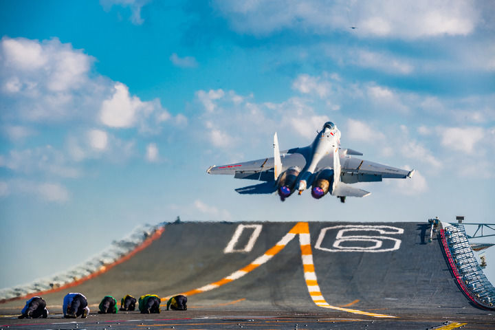 ↑殲-15艦載戰(zhàn)斗機(jī)從遼寧艦滑躍起飛(2014年12月1日攝)。新華社發(fā)(張凱 攝)
