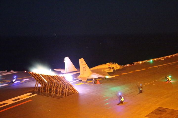 ↑遼寧艦組織夜間放飛殲-15艦載戰(zhàn)斗機(jī)(資料照片)。新華社發(fā)