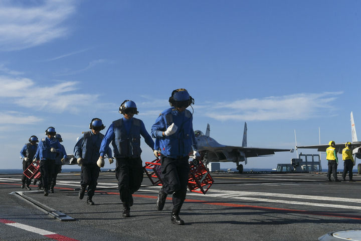↑遼寧艦官兵進(jìn)行艦載戰(zhàn)斗機(jī)起降甲板保障(2021年7月26日攝)。新華社發(fā)(汪良偉 攝)