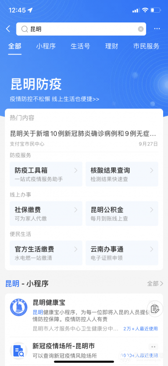 昆明信息港訊 記者昝娟娟 記者獲悉,基于目前昆明疫情防控態(tài)勢,支付寶緊急上線了“昆明”一站式防疫服務頁面,出入昆報備、密接自查、查\做核酸、生活繳費等服務都可以在線辦理,市民足不出戶也可以享受多項生活服務。上支付寶搜“昆明”即可直達一站式防疫頁面。