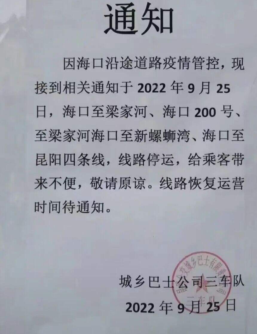 9月27日中午,市民趙先生想去西山區(qū)??谵k事,他到梁家河乘坐開往海口的C26路時,發(fā)現(xiàn)公交車已停運(yùn)。據(jù)了解,因海口沿途道路疫情管控,從9月25日起,海口至梁家河,海口200號至梁家河,海口至新螺螄灣,海口至昆陽這四條公交線已暫停停運(yùn)。線路恢復(fù)運(yùn)營時間,還待有關(guān)部門通知。(昆明日報 全媒體記者楊官榮)