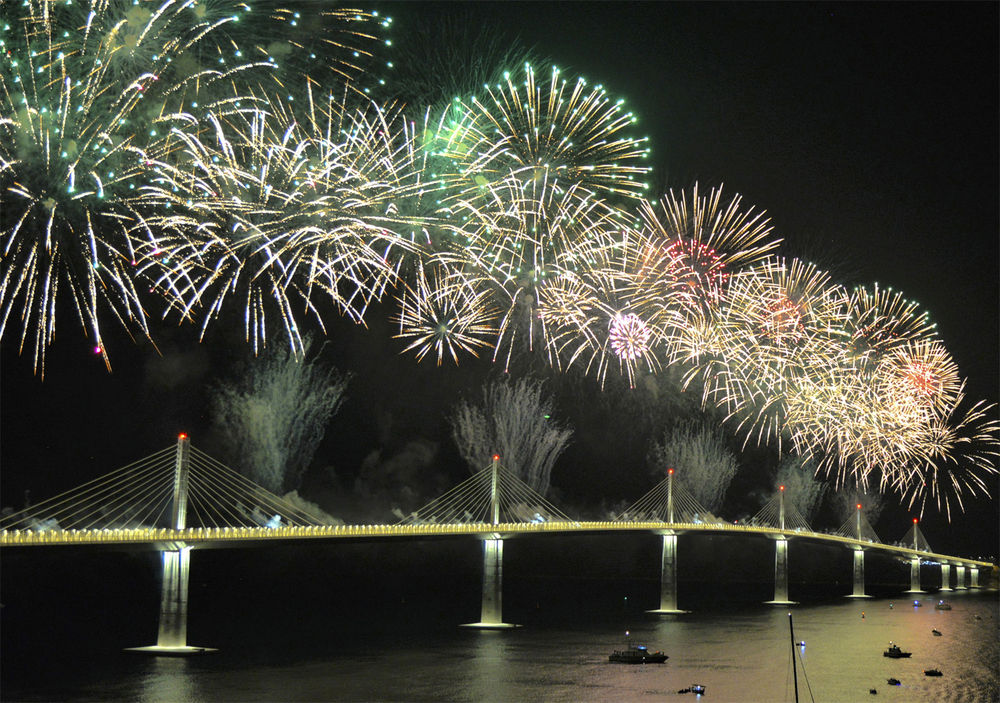 這是2022年7月26日在克羅地亞科馬爾納拍攝的由中企承建的佩列沙茨大橋通車儀式上的焰火表演。新華社記者 李學(xué)軍 攝