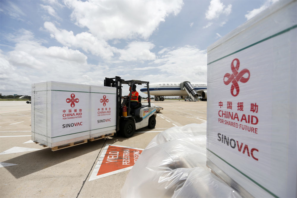 2021年10月14日,工作人員在柬埔寨金邊國際機(jī)場運(yùn)輸中國政府援助柬埔寨的科興新冠疫苗。新華社發(fā)(批隆攝)