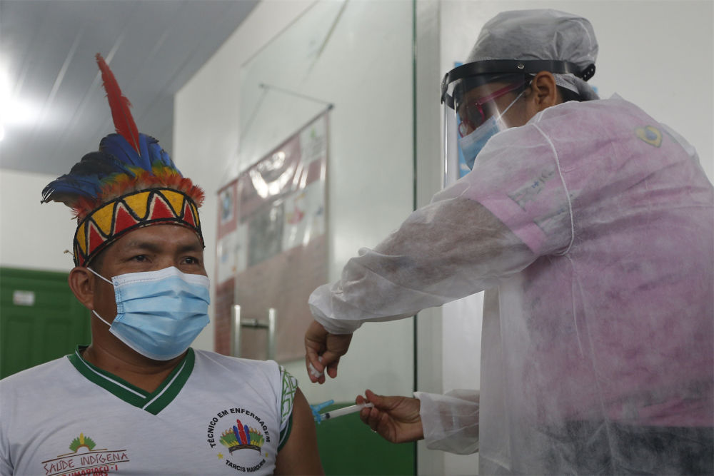 2021年1月19日,醫(yī)護(hù)人員在巴西亞馬孫州塔巴廷加市為一名原住民接種中國新冠疫苗。新華社發(fā)(盧西奧·塔沃拉攝)