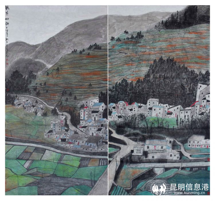 其中,董桃平的中國畫《毓秀山鄉(xiāng)》,取景家鄉(xiāng)富源縣的美麗鄉(xiāng)村,在這片肥沃的紅土地上,綠水青山春意盎然。董桃平用畫筆把身邊最熟悉的景色描繪出來,表達(dá)了對(duì)祖國繁榮富強(qiáng)欣欣向榮新農(nóng)村景象的贊美和對(duì)這片土地的深深熱愛。