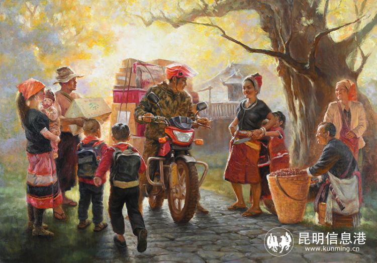 聶鋼的油畫《快遞送進(jìn)佤山寨》通過村民收貨快遞的喜悅之情,表現(xiàn)了政府部門通過資金扶持,加大物流基礎(chǔ)設(shè)施建設(shè),打通了農(nóng)村快遞物流的“最后一公里”,對(duì)推進(jìn)農(nóng)產(chǎn)品進(jìn)城到戶、工業(yè)品下鄉(xiāng)入村,促進(jìn)城鄉(xiāng)商品流通、拓展農(nóng)村消費(fèi),促進(jìn)鄉(xiāng)村振興具有重要意義。