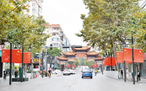 圖為正義路兩旁掛上鮮艷的五星紅旗。記者楊艷輝攝
