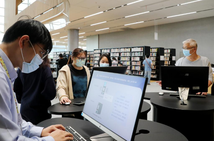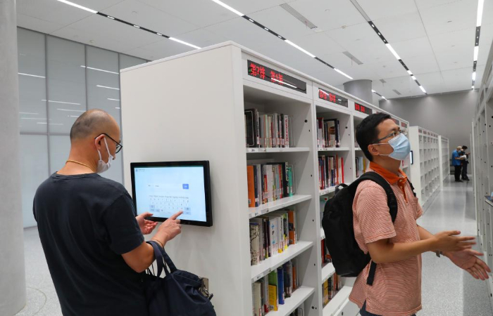 ??9月28日,讀者在智能書架區(qū)通過安放在書架上的電腦查詢書籍。