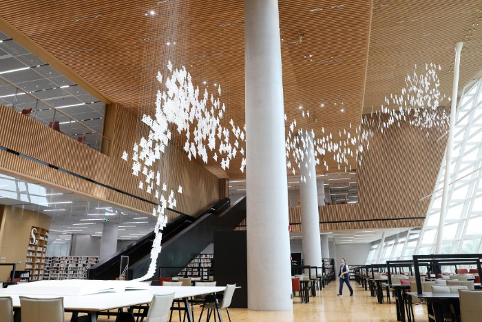 ??9月28日在上海圖書館東館南閱讀廣場內(nèi)拍攝的名為《鳥飛了》的藝術(shù)作品。