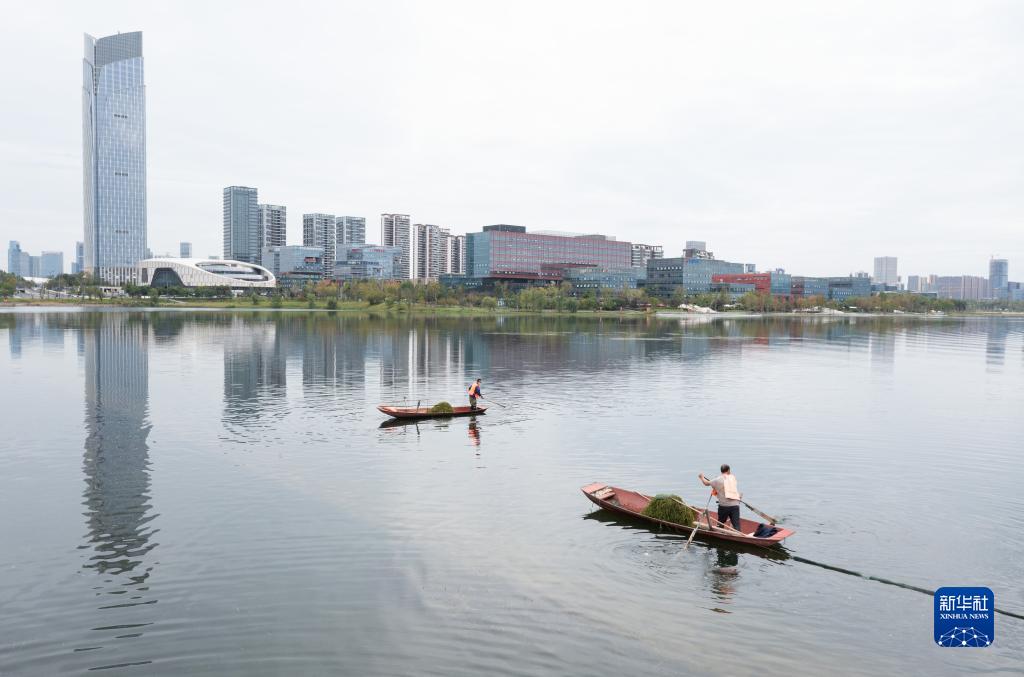 金秋時(shí)節(jié),四川天府新區(qū)興隆湖,4500余畝水面波光粼粼,湖水清澈見(jiàn)底,幾根水草隨波漂蕩。管護(hù)員賴小利站在小船上,熟練地伸出長(zhǎng)桿網(wǎng)兜一撈一翻一抖,水草便被甩上船。