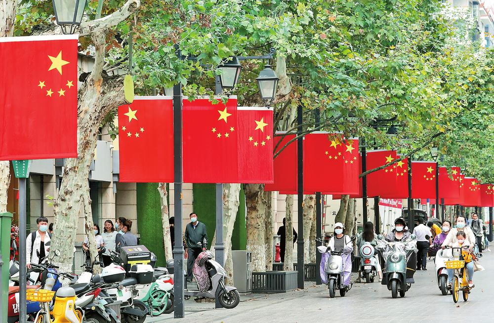 喜迎國慶,春城街頭洋溢著濃濃的節(jié)日氛圍。昆明市正義路和北京路等主干道沿線懸掛起鮮艷的五星紅旗,熱烈的“中國紅”迎風(fēng)招展,街頭大屏滾動播放著“慶祝中華人民共和國成立73周年”“喜迎黨的二十大”等視頻,引人注目。(云南日報 記者楊崢/攝)
