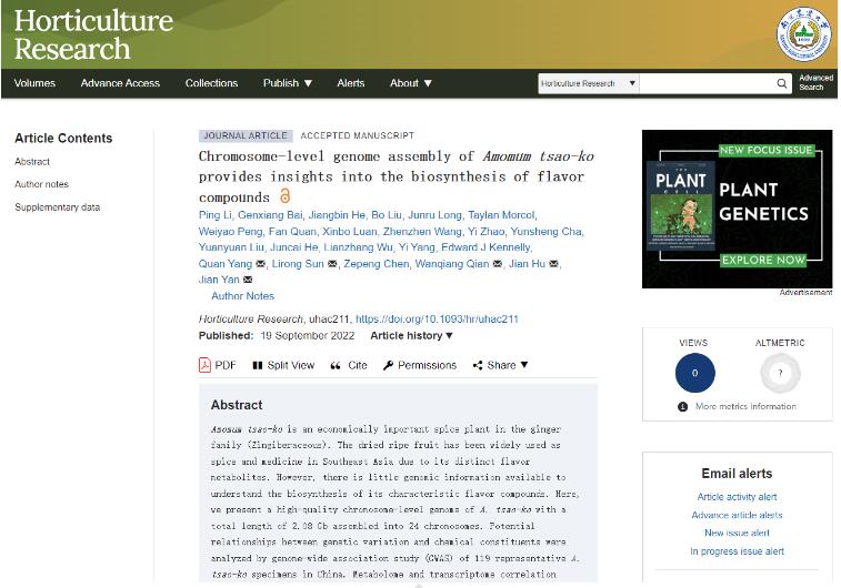 9月19日,國際學(xué)術(shù)期刊Horticulture Research在線發(fā)表了華南農(nóng)業(yè)大學(xué)聯(lián)合云南怒江綠色香料研究院、中國農(nóng)業(yè)科學(xué)院深圳基因組研究所等8家單位完成的題為《Chromosome-level genome assembly of Amomum tsao-ko provides insights into the biosynthesis of flavor compounds》的研究論文。該研究組裝了草果的染色體級別基因組,揭示了草果中特殊的香氣和辣味的物質(zhì)在不同組織部位、果實不同成熟時期的含量、調(diào)控基因和合成途徑。