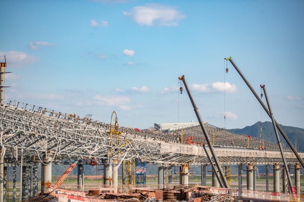 10月1日,在中建八局承建的重慶江北國際機(jī)場T3B航站樓施工現(xiàn)場,上千名建設(shè)者堅(jiān)守崗位作業(yè)。新華社記者 黃偉 攝