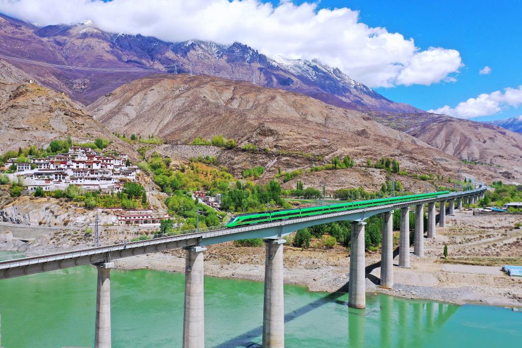 復(fù)興號列車行駛在西藏朗縣境內(nèi)(2022年4月14日攝)。 新華社記者 覺果 攝