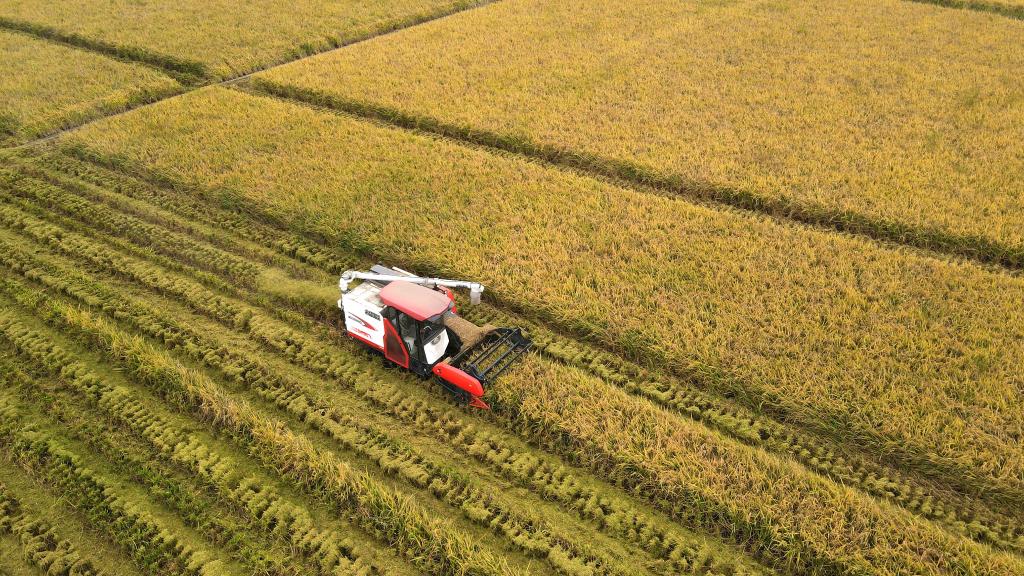 9月28日,合肥市肥西縣花崗鎮(zhèn)河豐社區(qū)村民駕駛收割機(jī)收獲中稻(無人機(jī)照片)。新華社記者 劉軍喜 攝