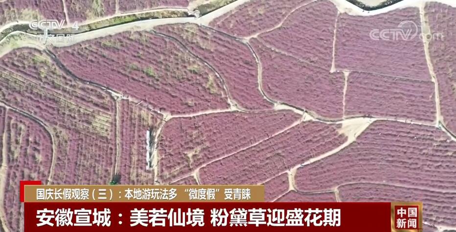 在安徽宣城,近一百畝的粉黛亂子草迎來花期。從空中俯瞰,粉黛似錦,隨風蕩漾,花海如潮,美若仙境。