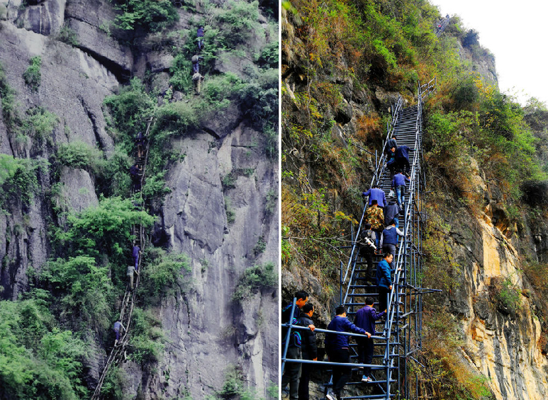 左邊這張,一架藤梯懸掛在近乎直上直下的峭壁上