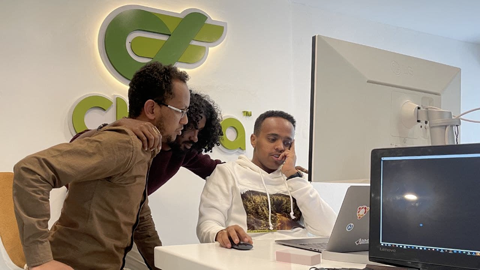 內(nèi)爾(右一)和他的創(chuàng)業(yè)團(tuán)隊在位于埃塞俄比亞首都亞的斯亞貝巴的公司工作。受訪者供圖