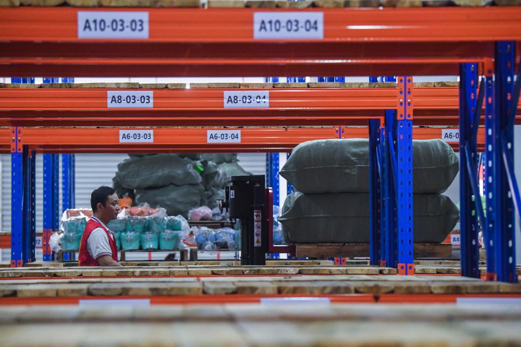 2022年6月27日,在義烏市蘇溪鎮(zhèn)愛德瑪電商園的“小眾云倉”站點內(nèi),工作人員在搬運(yùn)等待發(fā)貨的電商貨物。新華社記者徐昱攝
