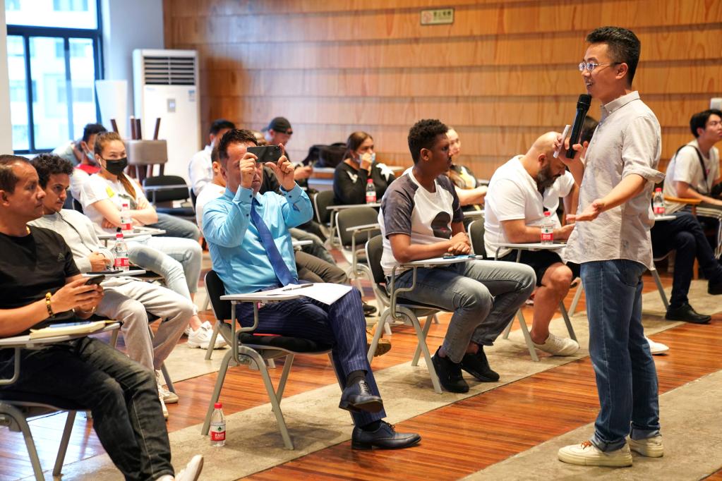 2020年6月19日,在“電商直播專項技能培訓(xùn)”外商創(chuàng)客專場直播培訓(xùn)課上,義烏工商職業(yè)技術(shù)學(xué)院創(chuàng)意設(shè)計學(xué)院講師與學(xué)員互動。新華社記者殷曉圣攝