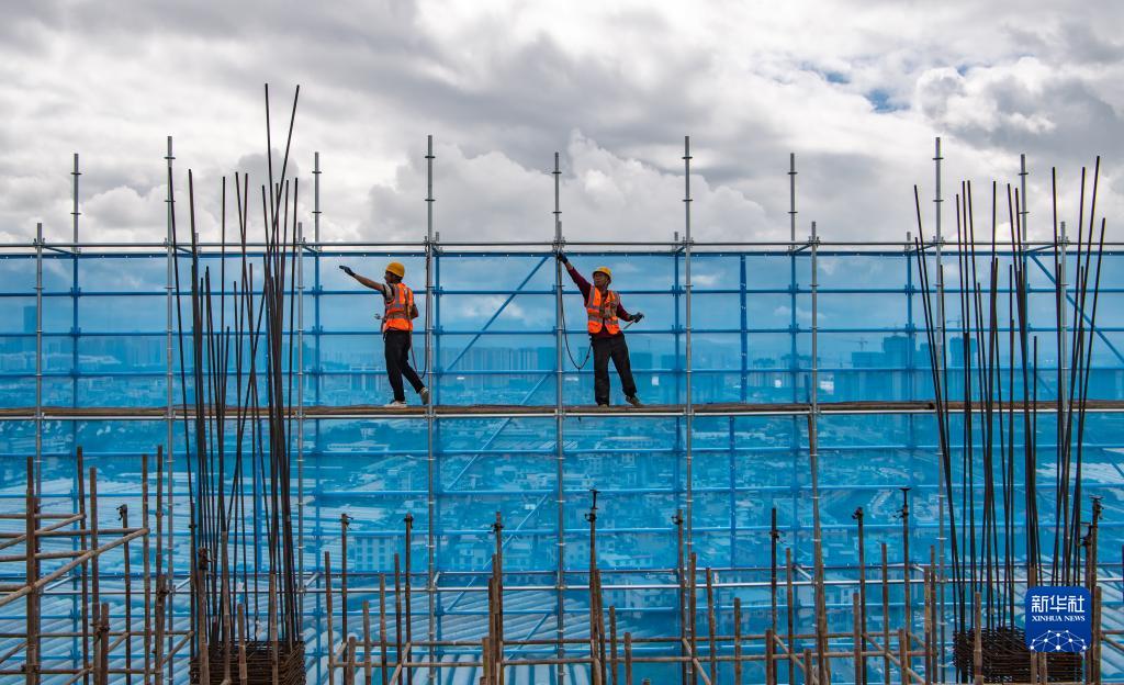 10月2日,中建七局西南公司工人李忠文(右)與王應(yīng)華在昆明斗南花卉小鎮(zhèn)花卉產(chǎn)業(yè)綜合配套服務(wù)區(qū)項(xiàng)目建設(shè)工地施工。新華社記者 江文耀 攝