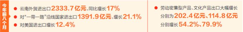 昆明海關(guān)10月2日通報(bào),今年前8個(gè)月,云南外貿(mào)進(jìn)出口2333.7億元,同比增長(zhǎng)17%。其中,出口1190.6億元,增長(zhǎng)12.3%;進(jìn)口1143.1億元,增長(zhǎng)22.3%。