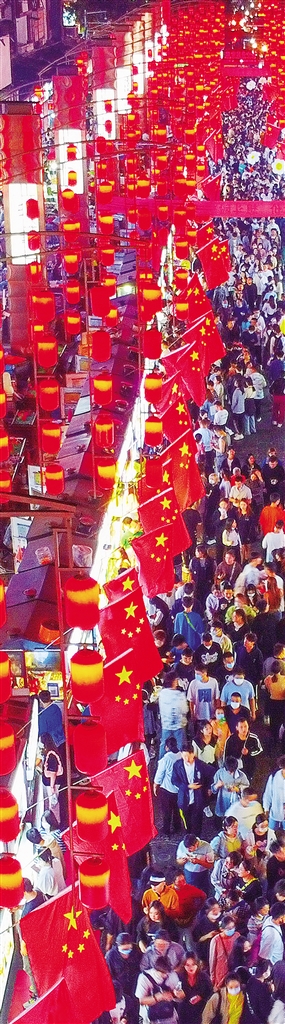 10月2日,河南省洛陽市老城區(qū)歷史文化街區(qū)十字街夜市,鮮艷的國旗、高懸的紅燈籠、誘人的美食讓市民及游客流連忘返。黃政偉攝(中經(jīng)視覺)