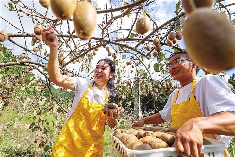 10月3日,果農(nóng)在貴州省岑鞏縣平莊鎮(zhèn)包東村獼猴桃種植基地忙采摘,搶抓國慶消費(fèi)季,確保市場供應(yīng)。胡攀學(xué)攝(中經(jīng)視覺)