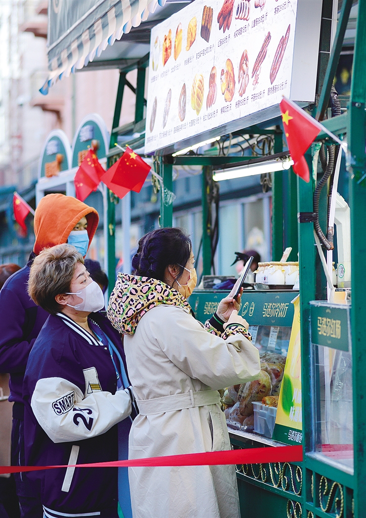 10月4日,在黑龍江省哈爾濱市中央大街,顧客正排隊(duì)掃碼購買當(dāng)?shù)靥禺a(chǎn)。