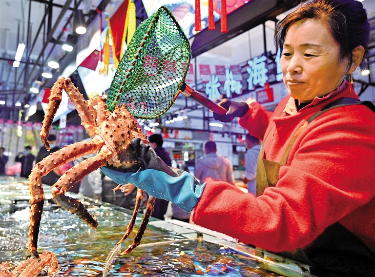 10月4日,在山東省日照市東港區(qū)石臼海鮮市場,工作人員在給顧客撈帝王蟹。國慶假日,該市海產(chǎn)品貨源充足、價(jià)格平穩(wěn)。朱元理攝(中經(jīng)視覺)