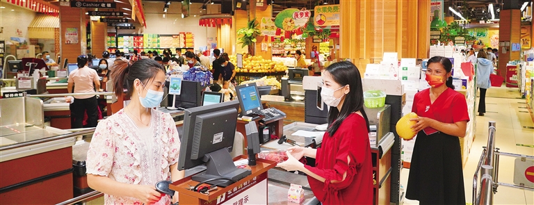 10月4日,江西省龍南市宏昌超市廣場店,顧客在收銀臺排隊(duì)付款。國慶假日,龍南市多措并舉確保市場供應(yīng)。李林烜攝(中經(jīng)視覺)