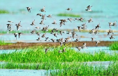 一群水鳥飛過閩江河口濕地上空。新華社發(fā)