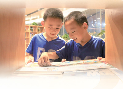小讀者在山東威海榮成市市民文化公園“城市書房”閱讀繪本。李保衛(wèi)攝