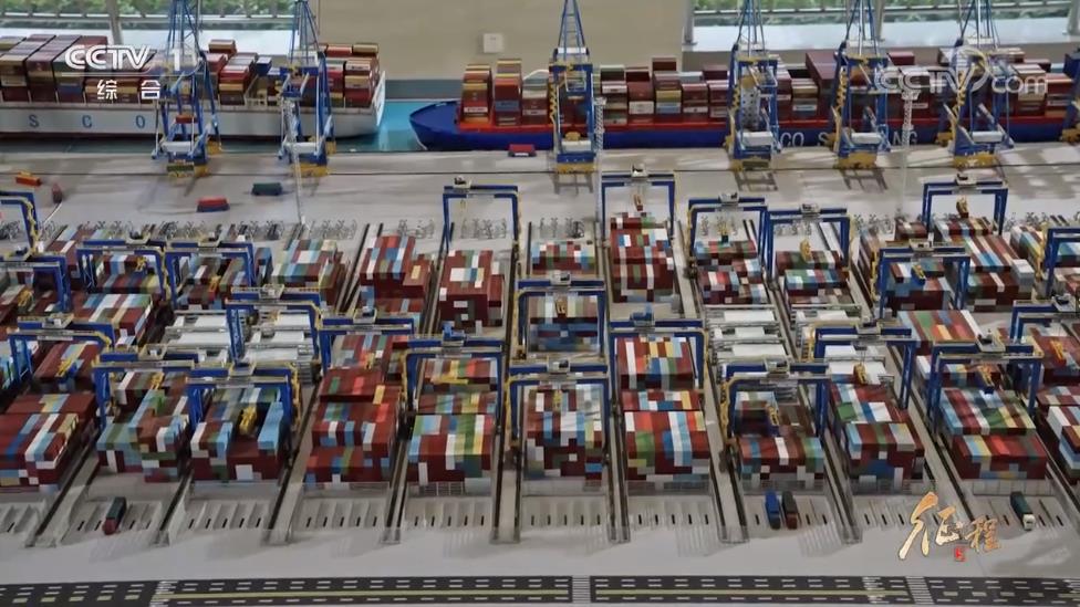 岸邊,三千多個集裝箱,裝滿中國生產(chǎn)的光伏設備、電子機械、日用百貨,也等待這艘大船將它們運往世界各地。