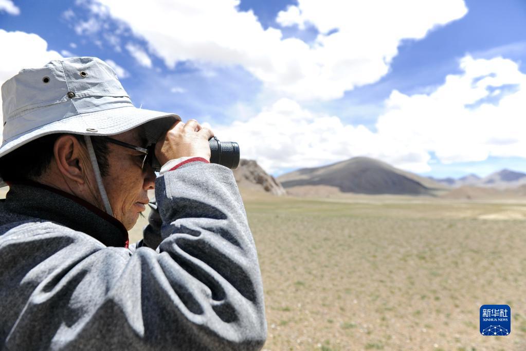 在羌塘國(guó)家級(jí)自然保護(hù)區(qū),野保員用望遠(yuǎn)鏡觀察野生動(dòng)物(2018年8月4日攝)。新華社記者 張汝鋒 攝