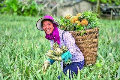 海南省瓊海市長坡鎮(zhèn)青葛村的農(nóng)民在采收菠蘿。新華社發(fā)