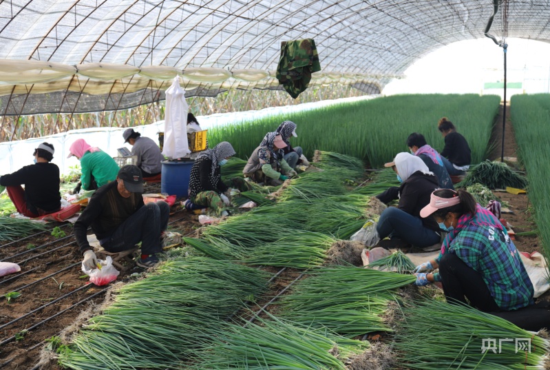 三里堡子村民在整理新收獲的香蔥(央廣網記者 李文清 攝)