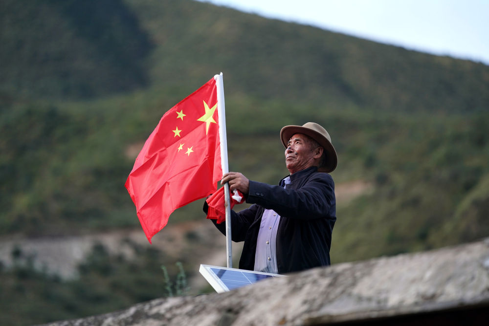 昌都市江達(dá)縣崗?fù)写宕迕衿瞻驮谖蓓敁Q上嶄新的國旗(2020年9月25日攝)。新華社記者 詹彥 攝