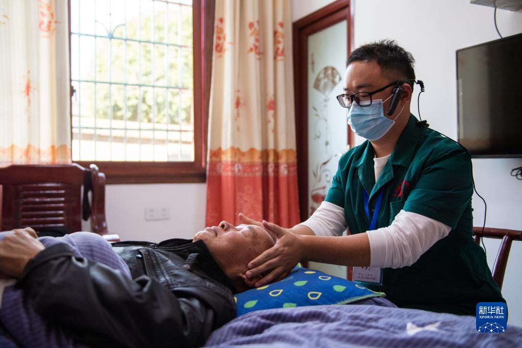 2021年11月12日,在湖南省長沙市長沙縣果園鎮(zhèn)田漢社區(qū),醫(yī)務(wù)人員彭永(右)為居家老人做頭部推拿。新華社記者 陳思汗 攝
