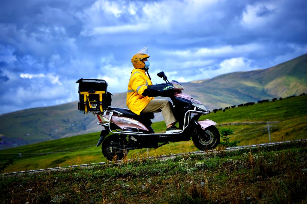 “最近好多商家爆單,我們經(jīng)常要送到電瓶車耗完電?!奔谉崴诘耐赓u站點(diǎn)共有7名騎手,擔(dān)負(fù)著整個(gè)色達(dá)縣城及周邊地區(qū)的配送任務(wù)。在縣城的大馬路上,在街角巷子口,甚至城外的金馬草原上,時(shí)常能看到他們穿梭的身影。