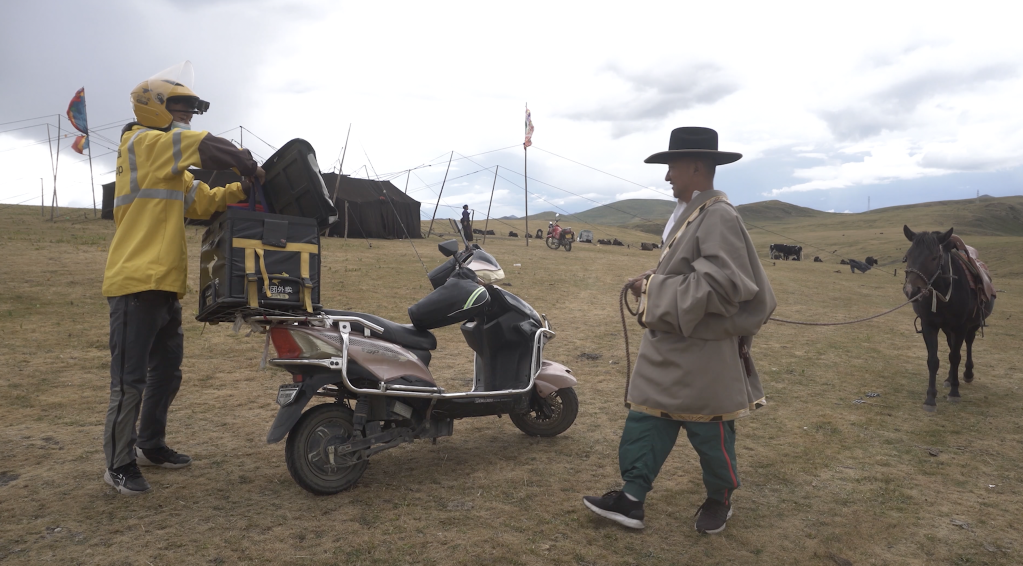 就連長期生活在草原上的牧民也開始點(diǎn)外賣。牧民們喜歡點(diǎn)川菜、漢堡和炸雞。甲熱經(jīng)常騎著電瓶車馳騁在草原上送餐,沿著牛羊踩踏出的小路,一直送到帳篷門口。
