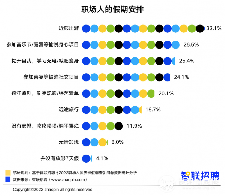 這個(gè)假期,近郊出游、參加愉悅身心項(xiàng)目位居前二,分別為33.1%和26.5%,也有25.4%的職場(chǎng)人選擇抓住假期時(shí)間提升自我。21.7%的職場(chǎng)人在追劇觀影打游戲等娛樂項(xiàng)目上花費(fèi)時(shí)間最長(zhǎng),其次是上課學(xué)習(xí)等自我充電、參加聚會(huì)喜宴等社交。