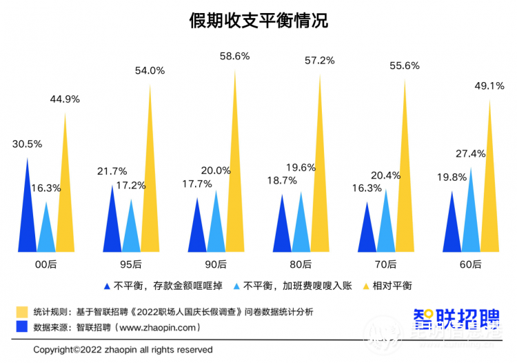 在沒有加班費(fèi)、還要給出份子錢的情況下,職場(chǎng)人的假期收支是否平衡?超半數(shù)職場(chǎng)人表示相對(duì)平衡,僅有19.3%的職場(chǎng)人不花反賺。值得注意的是,20.6%的男性職場(chǎng)人幾乎沒花錢、加班費(fèi)卻嗖嗖入賬,也有36.2%的男性收支相對(duì)平衡,有賺也有花,堪稱“不花反賺代言人”。這個(gè)假期損失最慘的當(dāng)屬00后,30.5%的00后存款“哐哐”往下掉,縮水很大。但從整體來看,多數(shù)職場(chǎng)人仍能保持相對(duì)平衡的收支狀態(tài)。