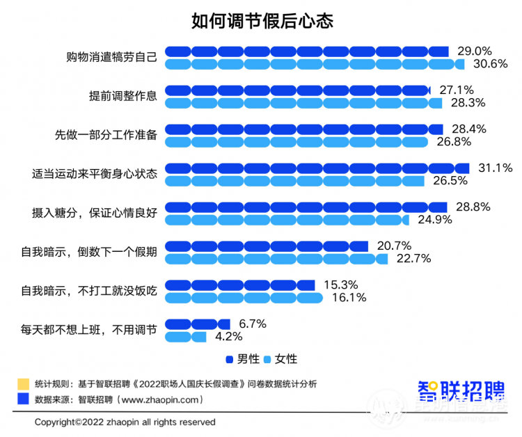 面對(duì)收假,57.0%的職場(chǎng)人迎來了“假期綜合癥”,排名前三的表現(xiàn)為生物鐘紊亂、身體疲倦、夢(mèng)想時(shí)光回溯,也有部分職場(chǎng)人出現(xiàn)深夜情感困擾、飲食問題、身體亞健康等狀態(tài)。也有43.0%的“天選之子”沒有假期綜合癥,對(duì)他們而言,運(yùn)動(dòng)、購物、攝入糖分為調(diào)節(jié)技巧Top 3。其中,29.0%的男性選擇購物調(diào)節(jié),他們的選擇與30.6%的女性用戶選擇相同。