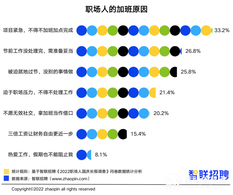 33.2%的職場(chǎng)人表示加班是因?yàn)轫?xiàng)目緊急、不得不加班加點(diǎn)完成,這一原因位列加班理由首位。其次是處理節(jié)前工作。另外,還有職場(chǎng)人是因被迫就地過節(jié)、除了工作沒別的事情做而選擇加班,這一比例高達(dá)25.8%。