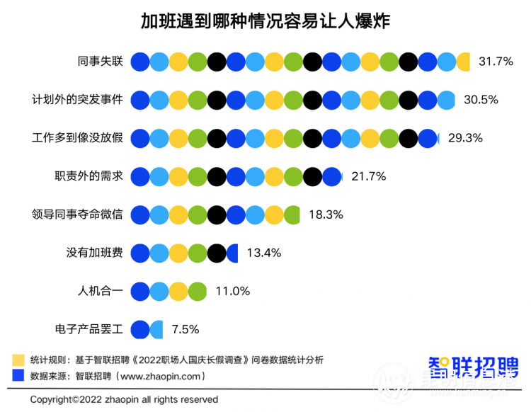 假期處理工作最讓職場(chǎng)人感到“心態(tài)爆炸”的并非沒有加班費(fèi),而是工作需要多方協(xié)同但聯(lián)系不上其他同事,該選項(xiàng)占比達(dá)31.7%,無加班費(fèi)占比僅有13.4%。此外,計(jì)劃外的突發(fā)事件、打亂原行程安排,同樣能點(diǎn)燃職場(chǎng)人“爆炸點(diǎn)”,這一比例高達(dá)30.5%。