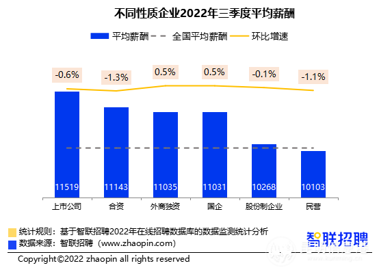 企業(yè)性質(zhì)方面,上市公司招聘薪酬仍居于首位,平均招聘薪酬為每月11519元,合資企業(yè)和外商獨(dú)資企業(yè)分列第二位和第三位,平均招聘月薪分別為11143元、11035元,國(guó)企招聘薪酬為每月11031元,股份制企業(yè)薪資首次高于全國(guó)平均水平,民營(yíng)企業(yè)招聘薪酬仍低于全國(guó)平均水平。